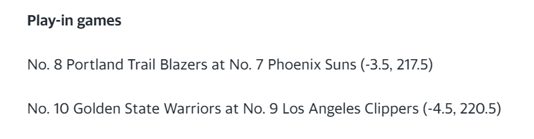 美国媒体《雅虎体育》已经为附加赛进行了赔率预测,西部7VS8方面看好手握主场优势的太阳赢开拓者3.5分,赔率217.5;
